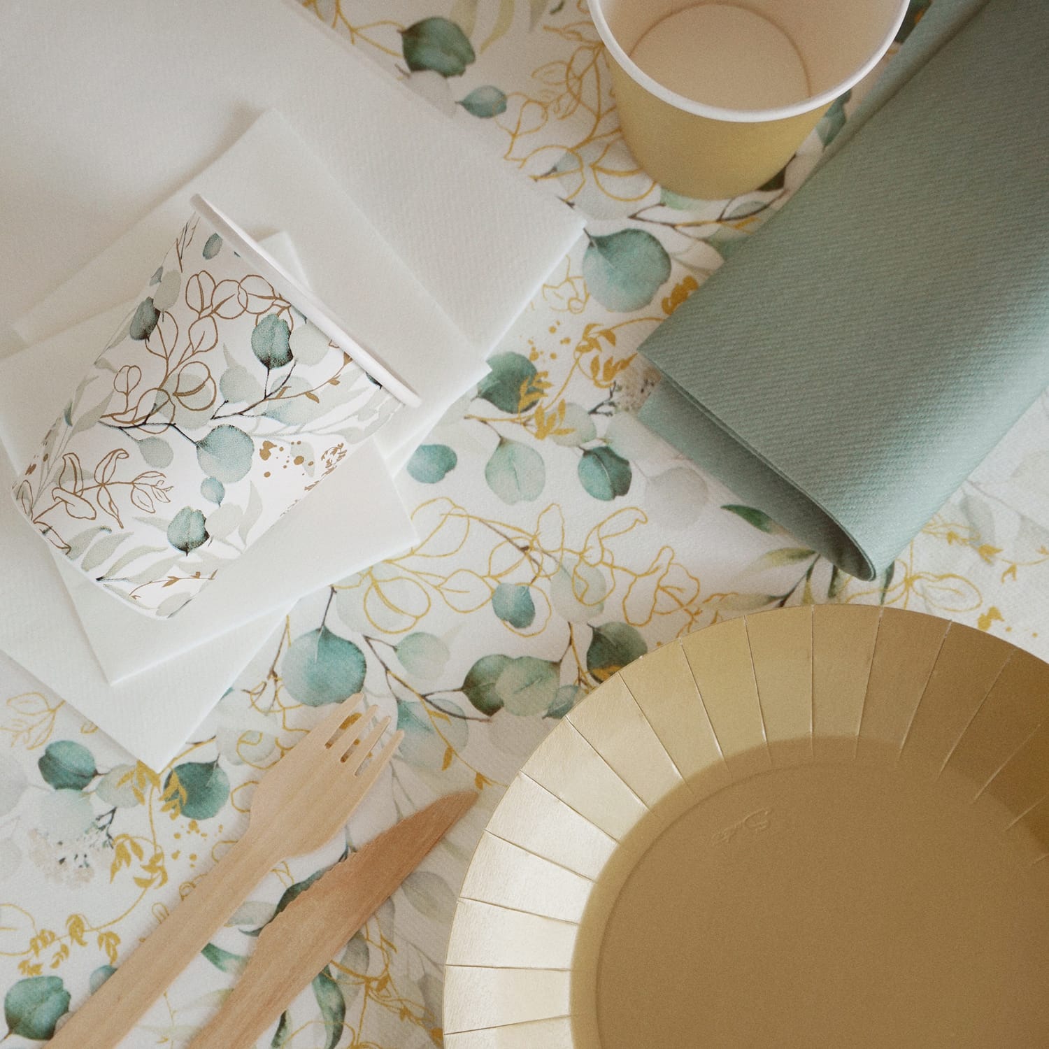 Apportez fraîcheur et naturel à vos réceptions avec notre chemin de table champêtre imprimé eucalyptus. Son motif délicat de branches d’eucalyptus dans des tons verts doux et détails doré invite vos convives dans une atmosphère élégante, moderne et chaleureuse. Symbole de sérénité et d’harmonie, l’eucalyptus s’accorde parfaitement aux décorations de table nature chic et champêtre raffiné. Confectionné en airlaid premium, ce chemin de table imite à la perfection l’aspect et le toucher du tissu, tout en offrant la praticité de l’usage unique. Facile à dérouler et à découpre, il sublime vos tables sans surcharge et reste impeccable tout au long du repas.