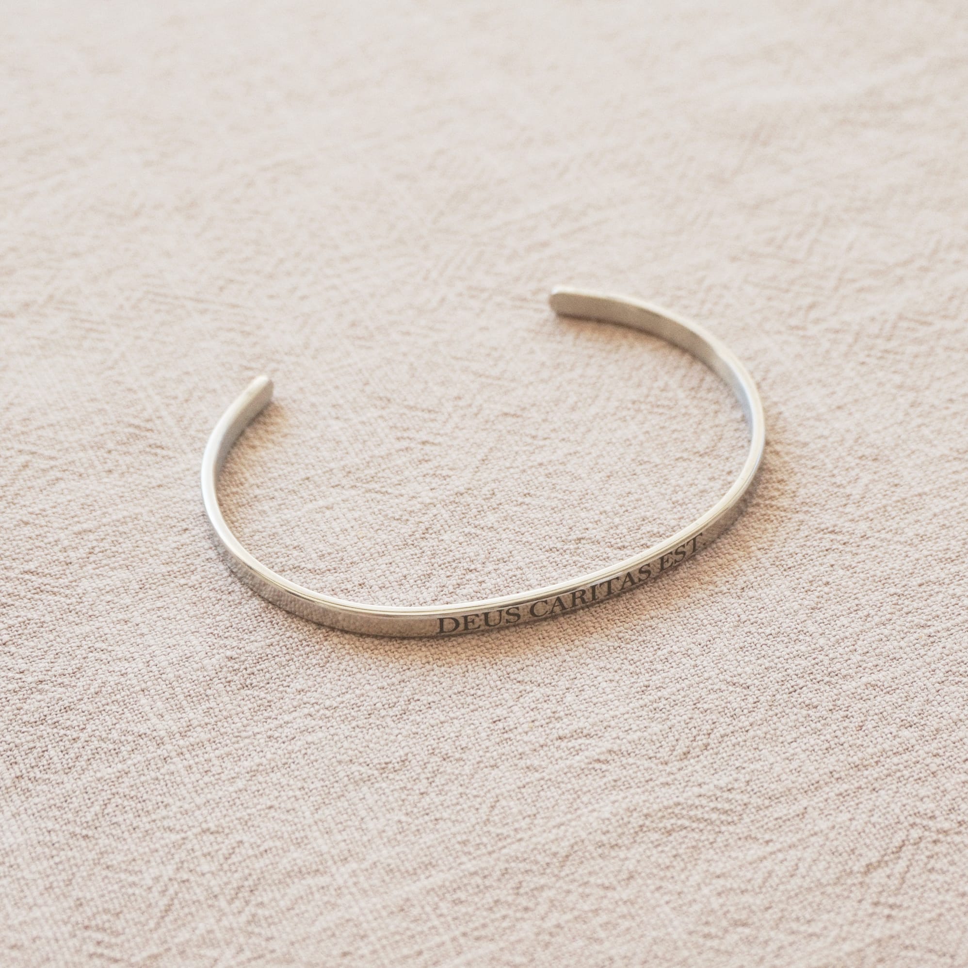 Épuré et fort de sens, ce bracelet en finition argentée porte la gravure latine Deus caritas est — « Dieu est amour ». Une phrase simple et universelle, inscrite à l’extérieur du bijou, pour garder près de soi l’essentiel.
