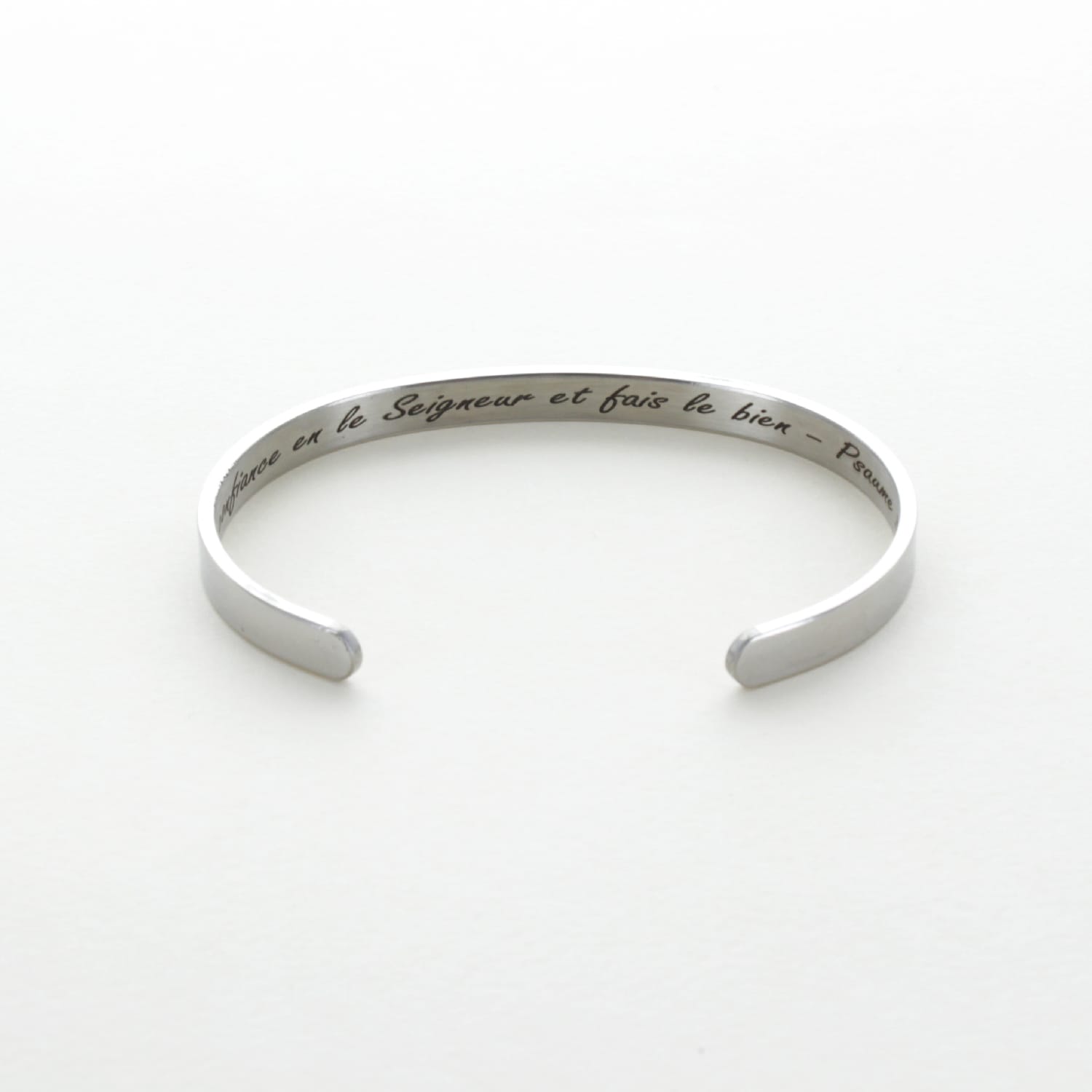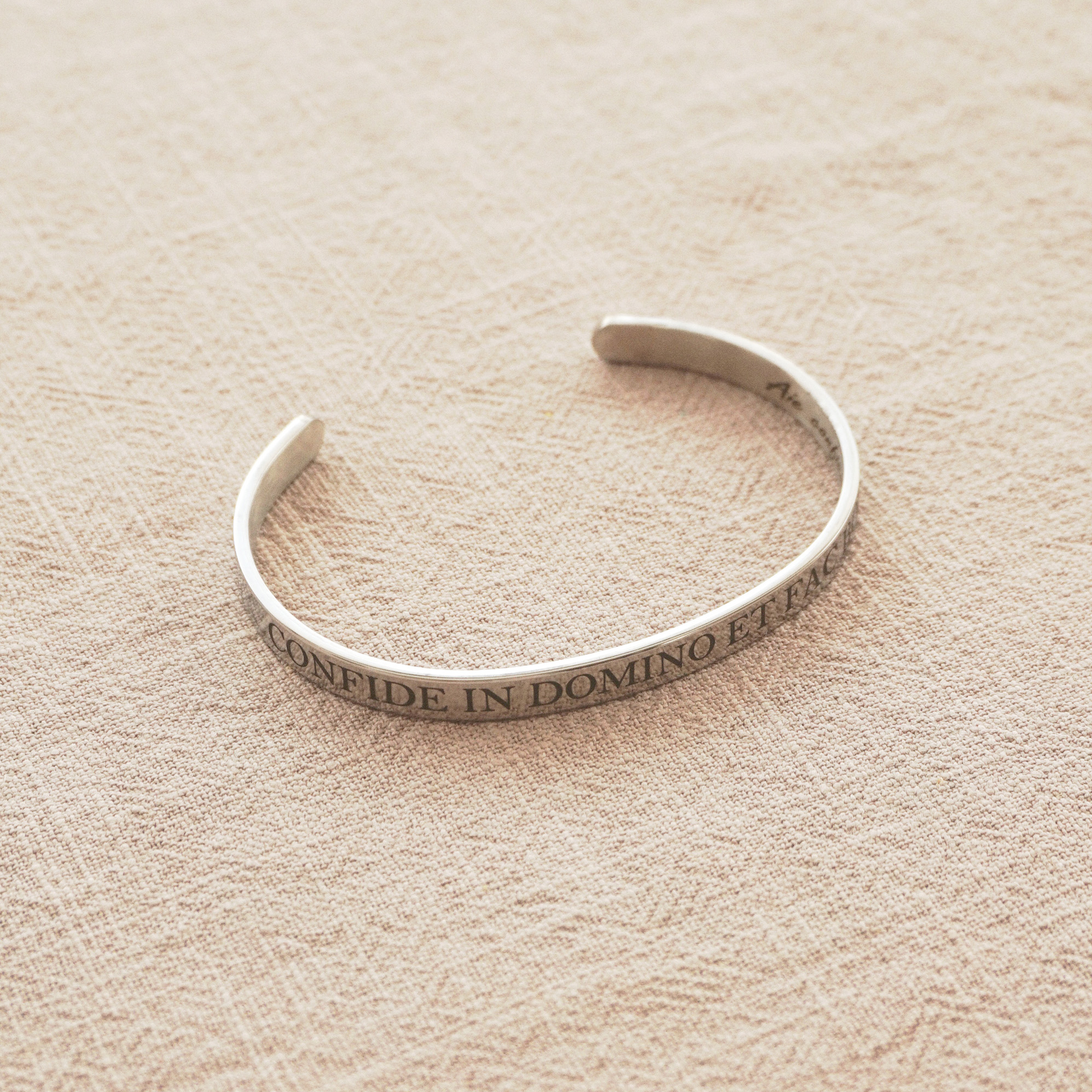 Ce jonc large à la finition argentée, gravé à l’extérieur des mots Confide in Domino et fac bonum — incarne une force tranquille. Son message biblique discret, mais profond, inspire confiance, engagement et droiture. Pensé pour les poignets masculins par son design affirmé, il peut aussi être porté par une femme en quête d’un bijou symbolique à forte présence. À l’intérieur, la version française de la citation est gravée avec sobriété.
