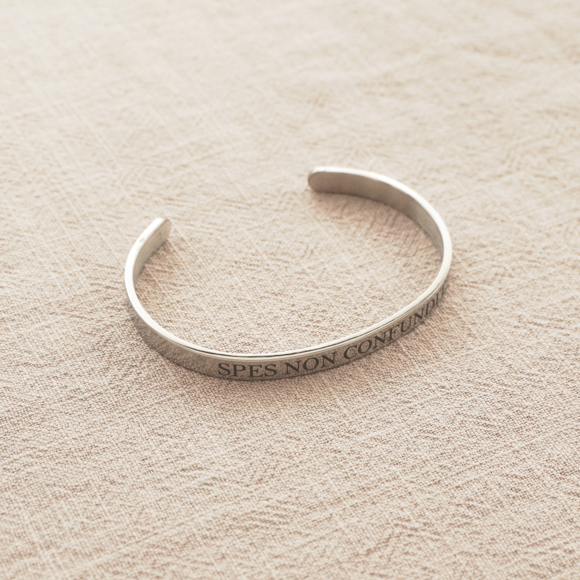 Ce jonc à la finition argentée est gravé à l’extérieur des mots Spes non confundit. À l’intérieur, la traduction française est gravée avec finesse pour garder ce message à portée de cœur.